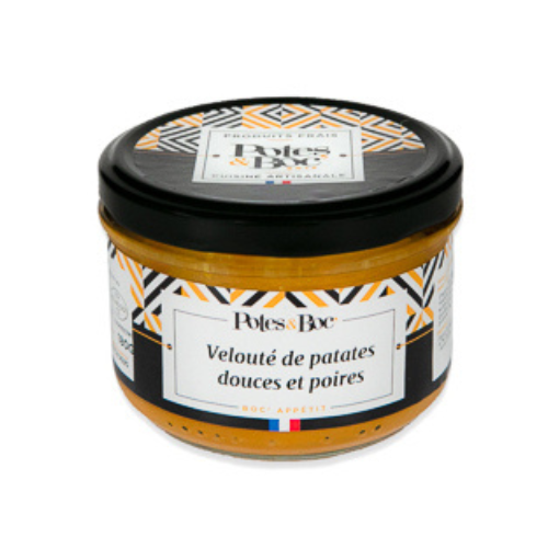 Liste des ingrédients : Patate douce 54,1%, eau, demi-poires williams au sirop 4,7% (poires Williams demi-fruits, eau, sucre, acidifiant : acide citrique), beurre demi-sel, sel.
