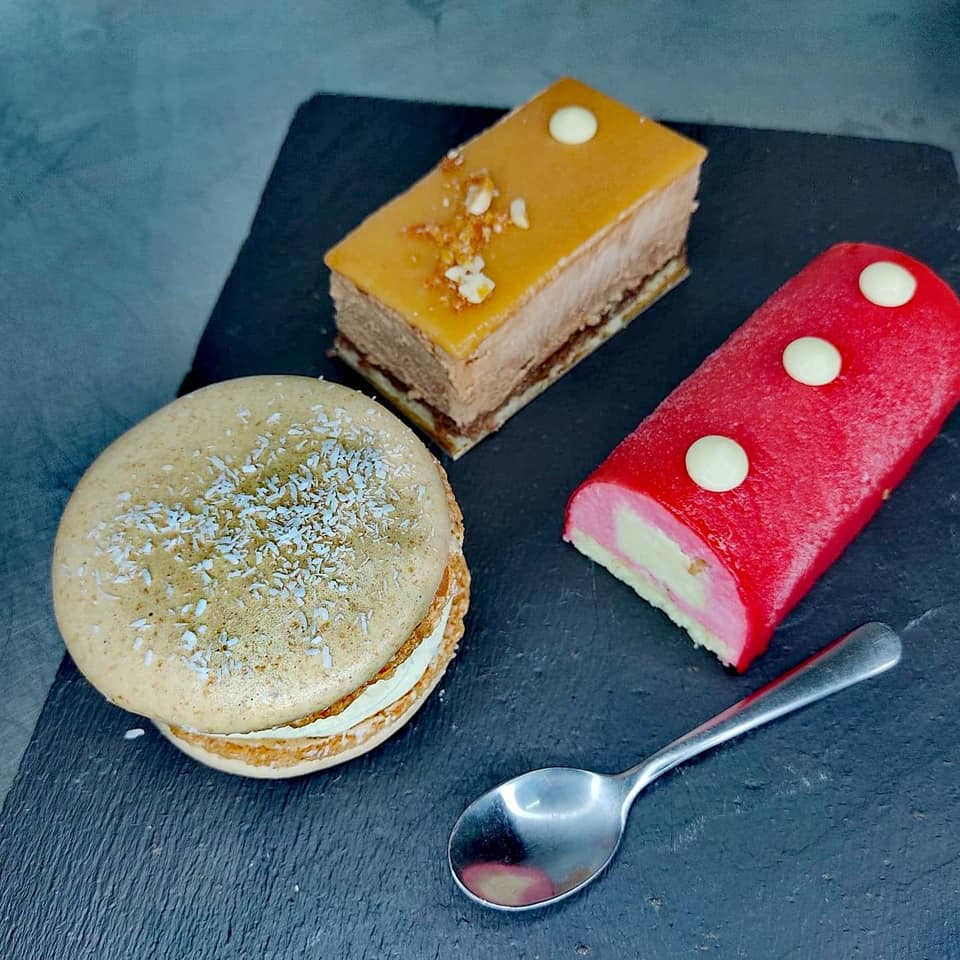 - Compotée de framboises, mousse chocolat blanc, spéculoos